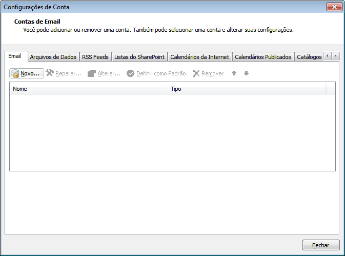 Irá aparecer uma nova janela para Adicionar Nova Conta de Correio Eletrônico