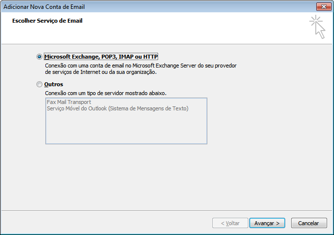 Selecione a opção que diz Microsoft Exchange, POP3, IMAP ou HTTP.