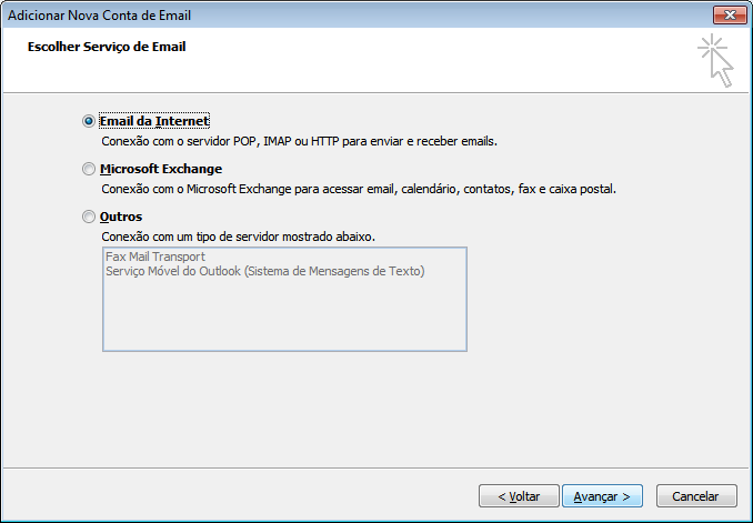 Irá aparecer novamente a janela para Escolher o Serviço de Email.