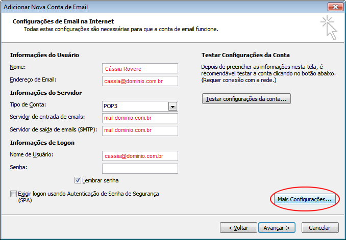 - Em Servidor de saída de emails (SMTP), insira mail.dominio.com.br;